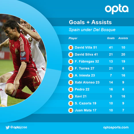 Selama ditangani Vicente del Bosque, David Silva membukukan 20 gol di pentas internasional. Selama periode tersebut, gelandang serang Manchester City mantan pilar Valencia itu juga mengemas 21 assist dengan seragam La Furia Roja.