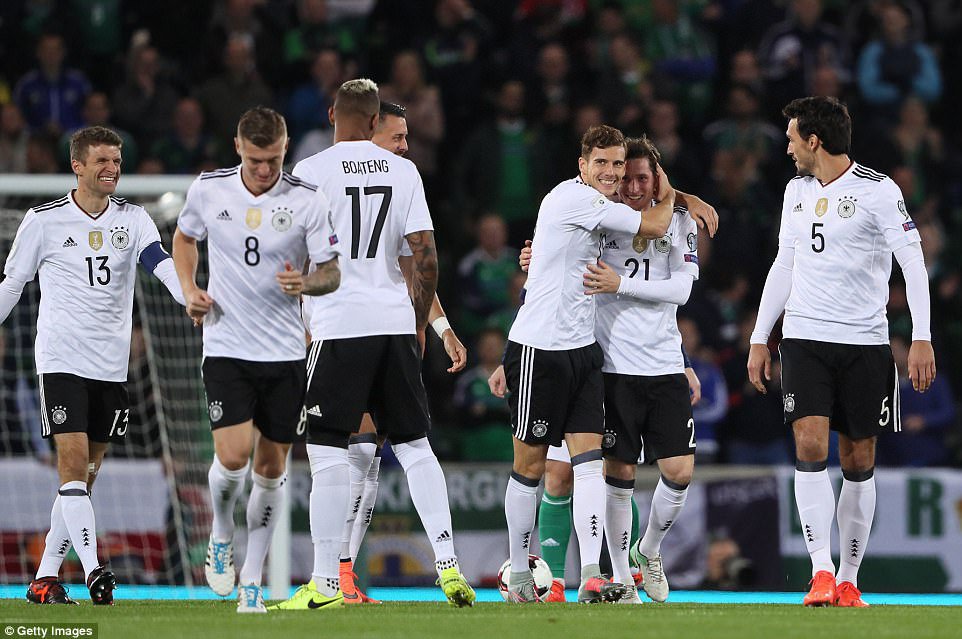 Jerman memastikan diri lolos ke putaran utama Piala Dunia 2018 saat melawan tuan rumah Irlandia Utara pada matchday 9. Jerman menang 3-1 lewat gol-gol Sebastian Rudy menit 2, Sandro Wagner menit 21 dan Joshua Kimmich menit 86.