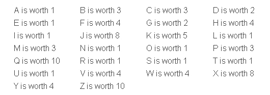 Dalam permainan ini, ada sejumlah karakteristik huruf yang memiliki nilai lebih tinggi ketimbang huruf lainnya. Biasanya alfabet yang memiliki nilai tinggi adalah yang jarang digunakan dalam kata-kata bahasa Inggris, seperti Q (10 poin), Z (10 poin), J (8 poin), dan X (8 poin).