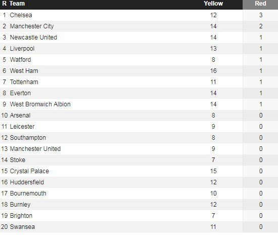 Chelsea juga telah mengoleksi 12 kartu kuning, terbanyak ke-8 di Premier League 2017/18 sejauh ini. Untuk kartu merah (3), mereka berada di tempat teratas.