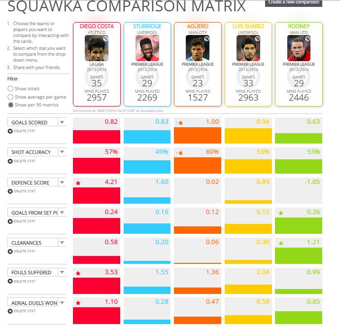 Dari perbandingan Costa dengan striker lainnya di EPL menunjukkan jika Costa unggul di duel dengan pemain lawan, serta beda tipis di akurasi tembakan. Dari perbandingan di bawah ini, aspek bertahan Costa unggul jauh di antara mesin gol Premier League lainnya.