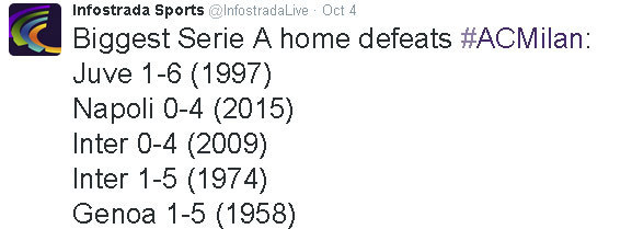 Sepanjang sejarah Serie A, ini bukan pertama kalinya Milan menelan kekalahan kandang dengan margin empat gol atau lebih.