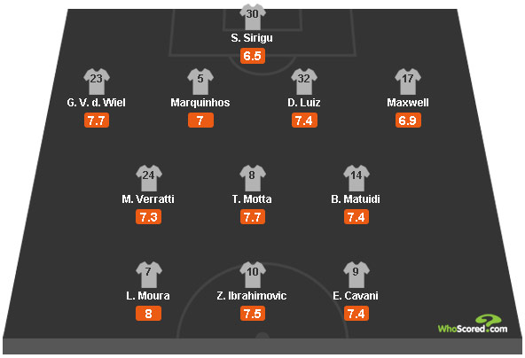 Tengah: Yohan Cabaye, Lucas Moura, Thiago Motta, Blaise Matuidi, Clement Chantome, Marco Verratti, Adrien Rabiot, Javier Pastore.