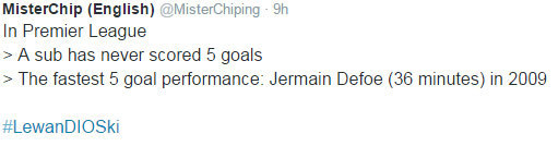 — MisterChip (English) (@MisterChiping) September 22, 2015Di tiga liga top Eropa lainnya, La Liga, Premier League dan Serie A, lima gol dalam satu pertandingan juga pernah disaksikan. Namun, apakah lebih cepat daripada Lewandowski?
