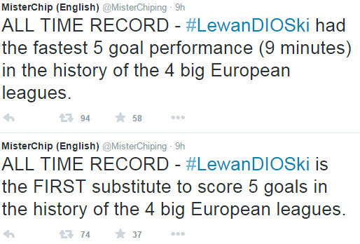 Lima gol Lewandowski dalam rentang waktu hanya sembilan menit pun tercatat sebagai lima gol tercepat oleh seorang pemain sepanjang sejarah empat liga top Eropa.