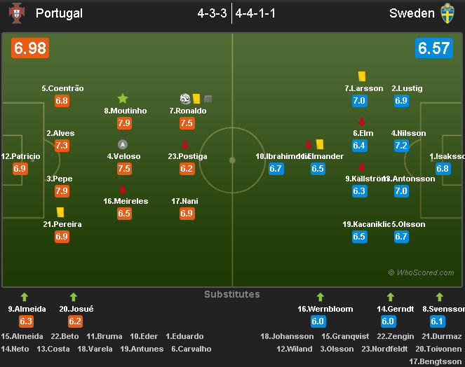 Dipasang sebagai ujung tombak serangan, di mana Swedia bermain dengan mode cukup defensif dan strategi bola-bola panjangnya terbaca oleh barisan belakang Portugal, Ibrahimovic mati kutu karena tak mendapatkan suplai operan yang cukup berarti.
