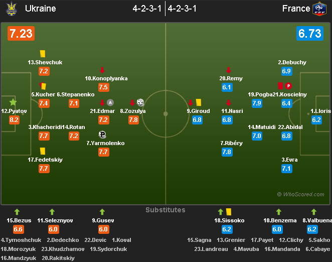 Sejumlah hal yang biasa kita lihat dari seorang Ribery hilang di laga tersebut. Sepanjang 2x45 menit, Ribery bahkan hanya menghasilkan 2 shot (1 on target) dan menciptakan 2 peluang (key pass). Ribery sukses diredam, Ukraina pun menyerang balik barisan belakang Prancis yang cukup rapuh dan mendapatkan dua gol kemenangan.