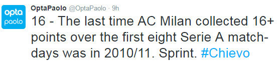 Milan sudah mengumpulkan 16 poin dalam delapan giornata awal. Terakhir kali Milan meraup 16 poin atau lebih dalam delapan giornata awal adalah saat masih dilatih Massimiliano Allegri dan diperkuat Alexandre Pato, Zlatan Ibrahimovic serta Robinho di musim 2010/11 silam. Itu adalah musim terakhir Rossoneri meraih Scudetto Serie A.