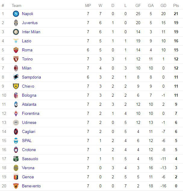Dengan tujuh kemenangan dari tujuh giornata pembuka, Napoli belum terhadang dan kini memiliki 21 poin di puncak classifica. Juventus, yang akhir pekan kemarin tertahan di markas Atalanta, terpaksa gagal menang untuk pertama kalinya musim ini dan mereka pun harus rela tertinggal dua poin di belakang sang rival.