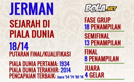 Jerman adalah tim langganan Piala Dunia dan sudah empat kali jadi juara. Sampai saat ini sudah 18 kali mereka berpartisipasi di turnamen tersebut.