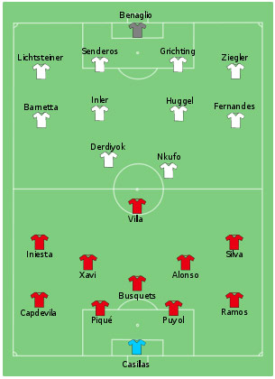 Xavi menjadi motor permainan Spanyol dari lini tengah dan La Furia Roja menang 1-0 berkat gol tunggal David Villa di menit 63, yang sempat memicu kontroversi karena sang striker dianggap offside saat menerima operan dari Xavi.