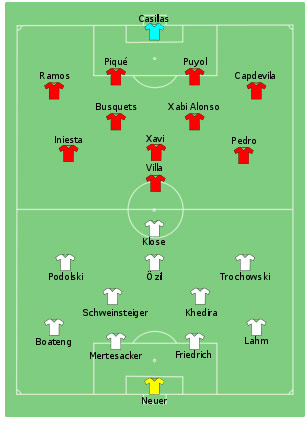 Namun, seperti deja vu, skor serupa (1-0) tercipta dan Jerman kembali jadi pihak yang kalah. Kalau dua tahun sebelumnya Spanyol berjaya berkat solitary goal Fernando Torres, kali ini mereka menyingkirkan Die Mannschaft berkat gol tunggal Carles Puyol meneruskan corner Xavi pada menit 73.