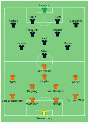 Dalam pertemuan pertamanya di turnamen besar (EURO maupun Piala Dunia) ini, Spanyol dan Belanda berebut gelar perdana.