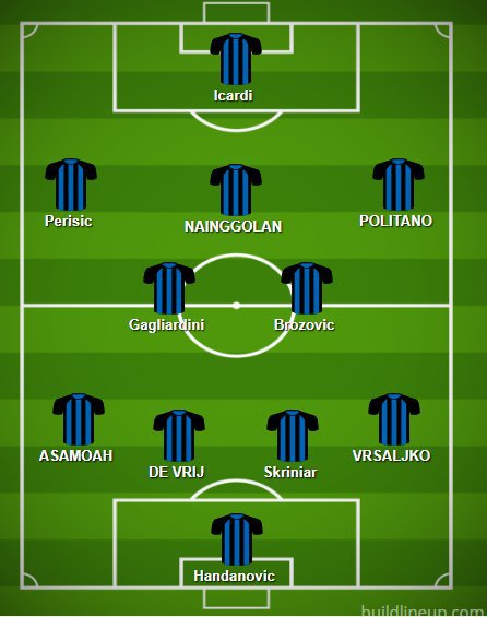Inter Milan (4-2-3-1): Handanovic; ASAMOAH, DE VRIJ, Skriniar, VRSALJKO; Gagliardini, Brozovic; Perisic, NAINGGOLAN, POLITANO; Icardi.