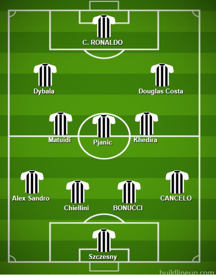 Juventus (4-3-3): Szczesny; CANCELO, BONUCCI, Chiellini, Alex Sandro; Khedira, Pjanic, Matuidi; Dybala, CRISTIANO RONALDO, Douglas Costa.