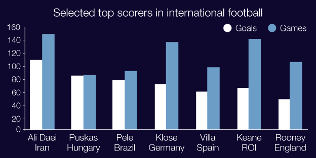 Ali Daei (Iran) menjadi yang terbaik dalam hal ini. Dari 149 penampilan, ia sukses mencetak 109 gol bagi Timnas yang dibelanya dengan rata-rata mencetak gol sebesar 0,73% per pertandingan. Rooney juga masih kalah dengan legenda Brasil Pele (77 gol dari 92 penampilan) dan legenda Hungaria, Ferenc Puskas (84 gol dari 86 pertandingan).