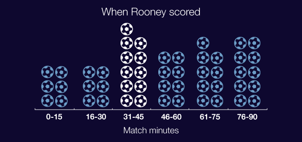Rataan menit yang paling sering membuat Rooney mencetak gol adalah di rentang menit ke-31 sampai 45. Total 11 gol menjadi bukti gol yang ia cetaknya di menit yang telah disebutkan. Sedangkan sisanya lebih sedikit.