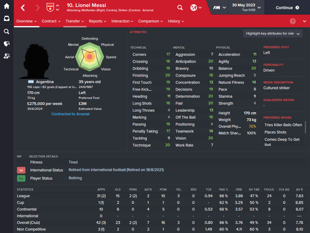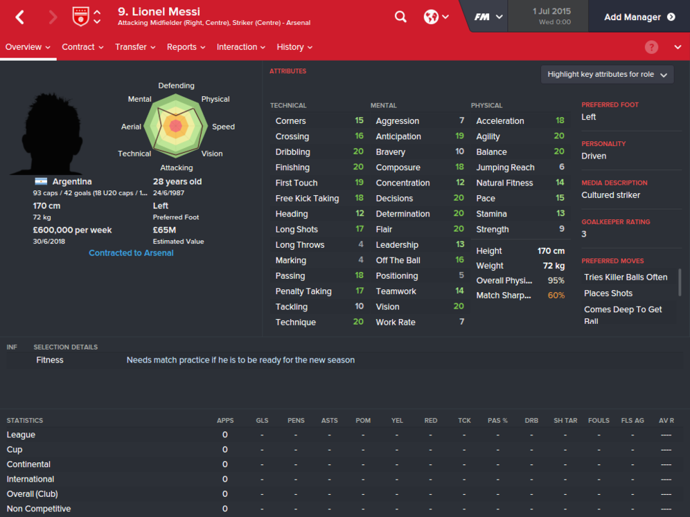 Just for fun saja, mari kita lihat hasil simulasi saat Messi pindah ke Arsenal di FM16. Simulasi ini dilakukan oleh Squawka.