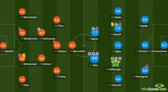 Silva mencetak hat-trick, sedangkan Calhanoglu juga menunjukkan magisnya dengan sumbangsih satu gol dan dua assist. Kalinic dan Franck Kessie, juga sama-sama pemain baru, masing-masing menyumbang satu assist. Sementara itu, Suso menyarangkan satu gol.