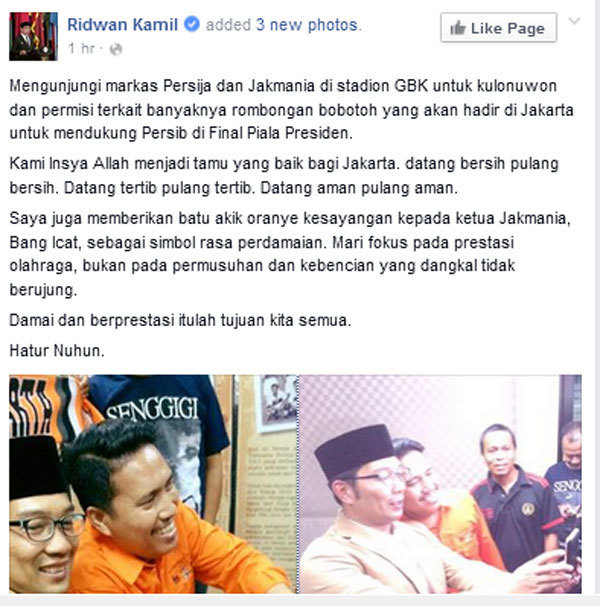 "Mengunjungi markas Persija dan Jakmania di stadion GBK untuk kulonuwon dan permisi terkait banyaknya rombongan Bobotoh yang akan hadir di Jakarta untuk mendukung Persib di Final Piala Presiden," tulis Ridwan Kamil di laman Facebook-nya, menceritakan pertemuannya dengan kubu The Jakmania.