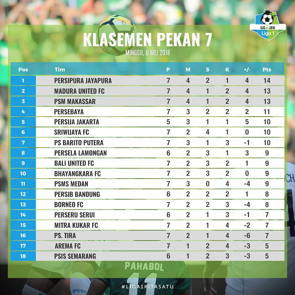 Posisi klasemen tersebut masih bisa bergeser karena masih ada satu laga yang belum dimainkan di pekan ketujuh. Senin (7/5), PSIS akan menjamu Persela Lamongan. Jika PSIS menang atau imbang, maka Arema FC akan menjadi juru kunci klasemen di pekan ketujuh.