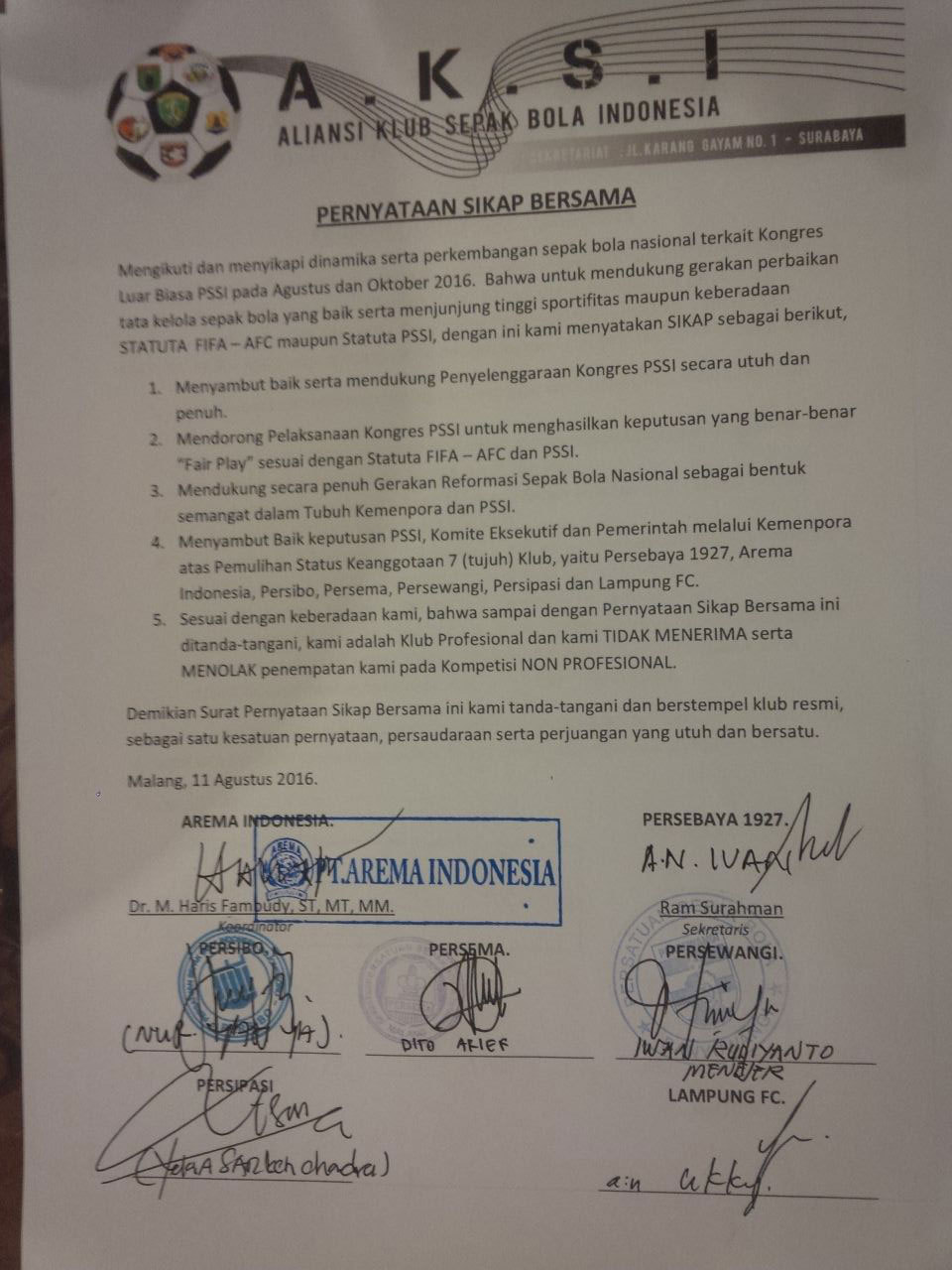 Sementara itu, dalam pertemuan tersebut, AKSI menelurkan sebuah pernyataan bersama. Selain menegaskan hanya mau bermain di kompetisi profesional, mereka juga mengharapkan adanya gerakan reformasi sepakbola nasional.