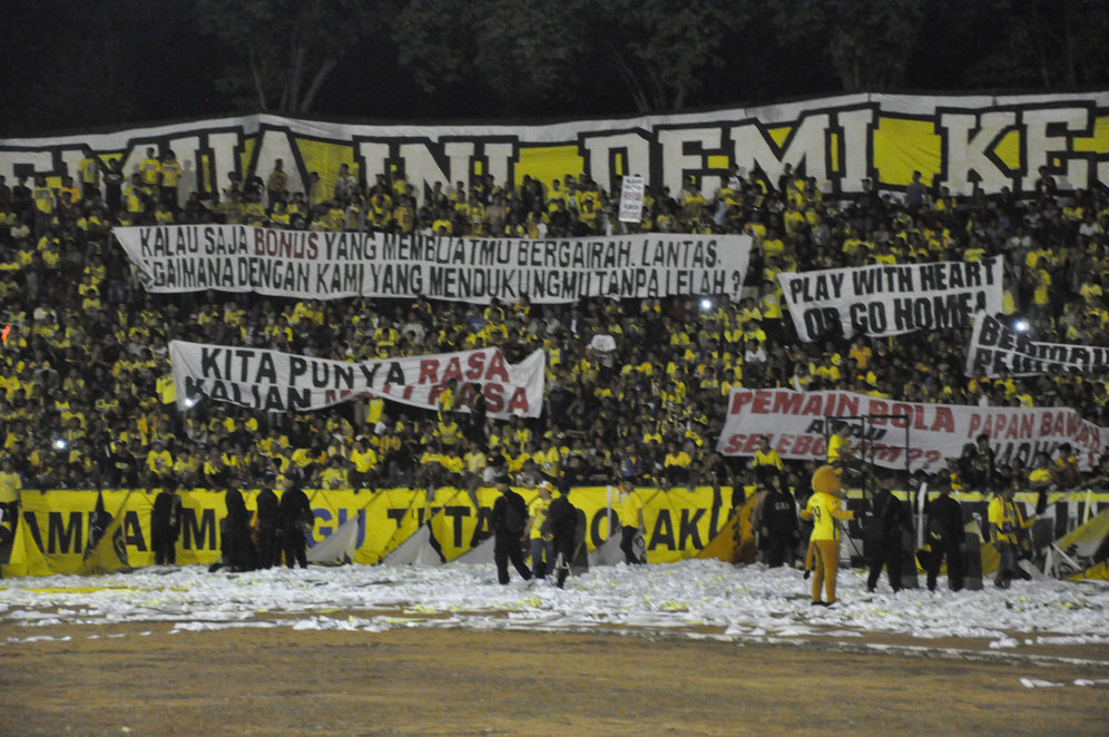 "Kalau hanya bonus yang membuatmu bergairah lantas bagaimana dengan kami yang mendukungmu tanpa lelah," salah satu ungkapan kekecewaan suporter yang dituangkan dalam poster.