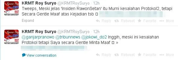Bola.net - Menpora Roy Suryo meminta maaf secara terbuka terkait insiden 'Rawon Setan', Minggu 23 Maret 2014. Permintaan maaf ini disampaikan Roy Suryo melalui akun twitter miliknya, @KRMTroysuryo.