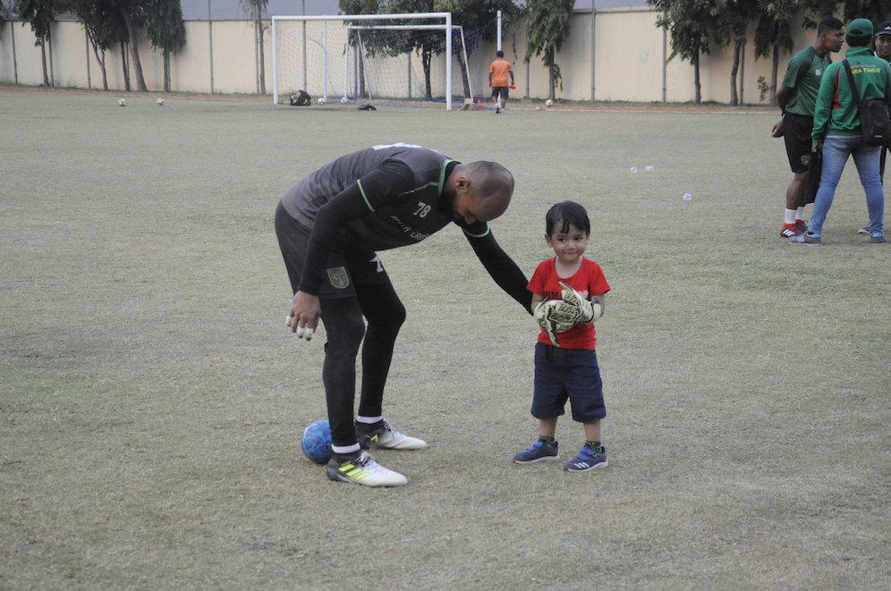 Bola.net - - Sebuah pemandangan unik terjadi selepas latihan Persebaya Surabaya di Lapangan Mapolda Jawa Timur, Selasa sore. Salah satu penjaga gawang Green Force, Alfonsius Kelvan dihampiri seorang anak dengan membawa bola berukuran mini.