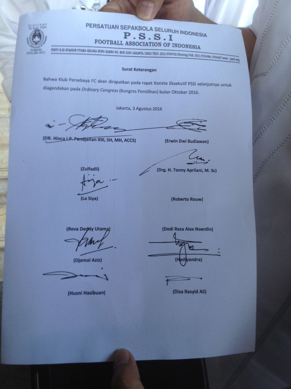 "Kami tahu bahwa anggota Exco PSSI Toni Aprilani telah menemui Bonek untuk menjelaskan nasib Persebaya. Kami putuskan bahwa masalah tersebut akan dibawa ke kongres," ungkap Hinca.