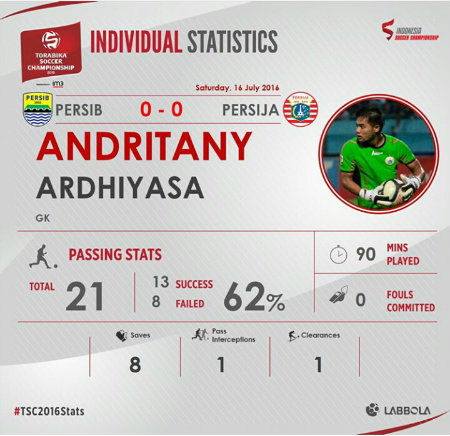 Selama 90 menit pertandingan, total Andritany telah melakukan penyelamatan (saves) sebanyak 8 kali. Termasuk ketika memblokir tembakan Sergio van Dijk pada menit ke-66.