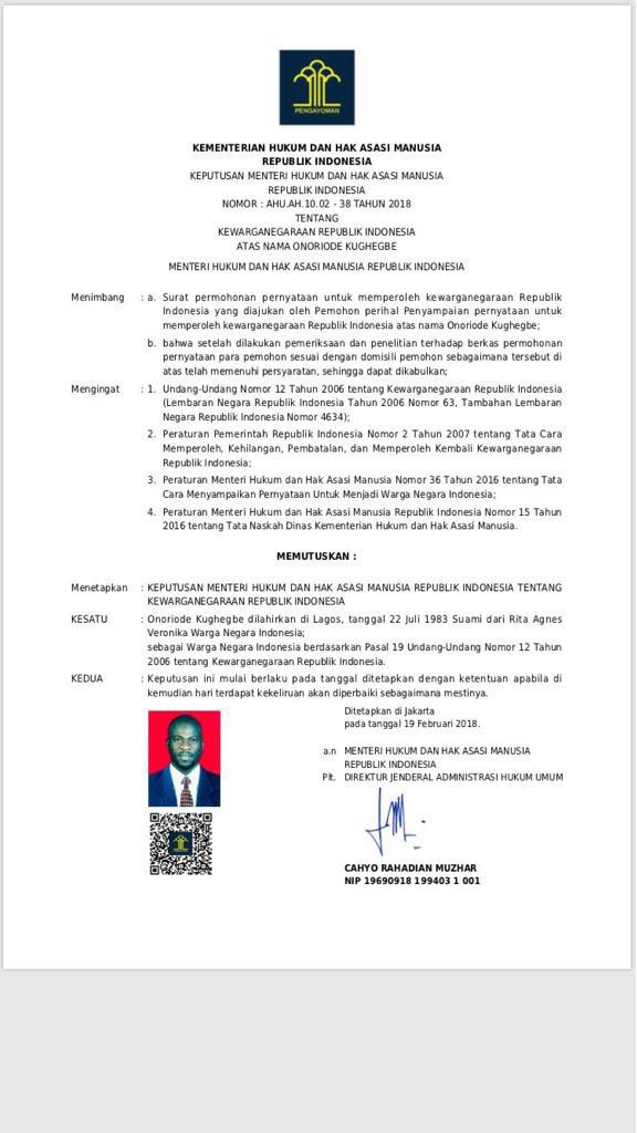 Kepastian status WNI pemain berusia 34 tahun ini hadir bersama terbtnya surat keputusan Menteri Hukum dan Hak Asasi Manusia Republik Indonesia Nomor: AHU.AH.10.02 - 38 TAHUN 2018. Surat keputusan ini dikeluarkan pada 19 Februari 2018 ini ditandatangani Direktur Jenderal Administrasi Hukum Umum, Cahyo Rahadian Muzhar.