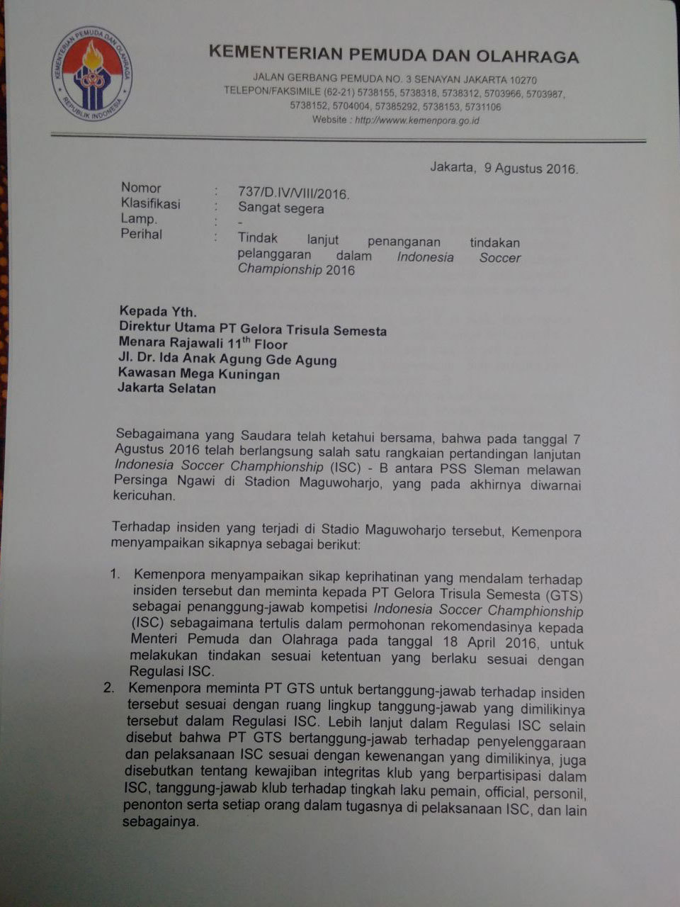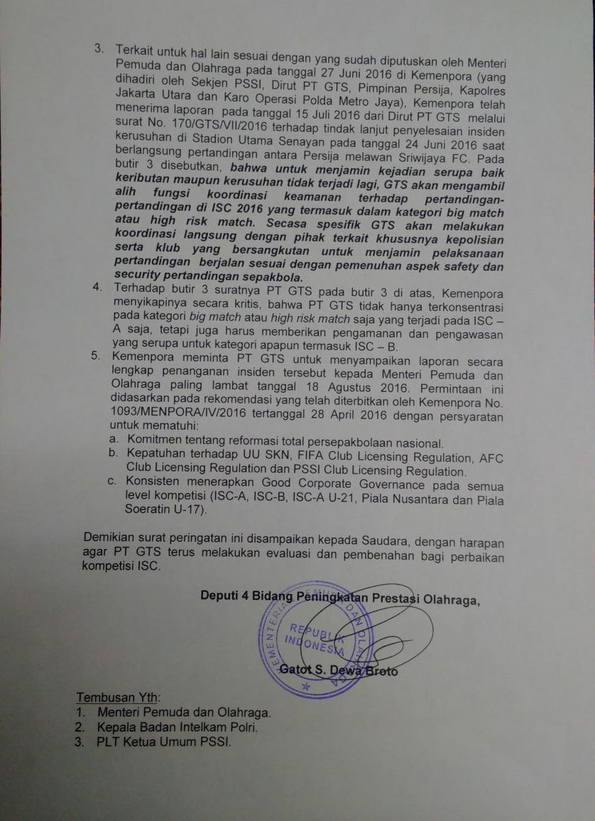 Hal tersebut juga sekaligus mengkritisi apa yang sudah diputuskan oleh Menteri Pemuda dan Olahraga (Menpora) Imam Nahrawi dengan PT GTS pada tanggal 27 Juni 2016 terkait tindak lanjut penyelesaian insiden kerusuhan di SUGBK pada tanggal 24 Juni 2016 saat berlangsung pertandingan antara Persija melawan Sriwijaya FC yang tertera dalam surat No. 170/GTS/VII/2016.