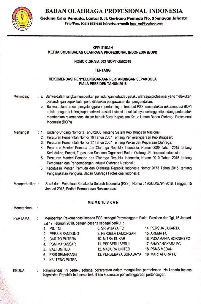 Bola.net - - Badan Olahraga Profesional Indonesia (BOPI) memastikan mengeluarkan rekomendasi terhadap bergulirnya turnamen Piala Presiden 2018. Namun, tak semua klub peserta turnamen pramusim ini mendapat rekomendasi dari BOPI.