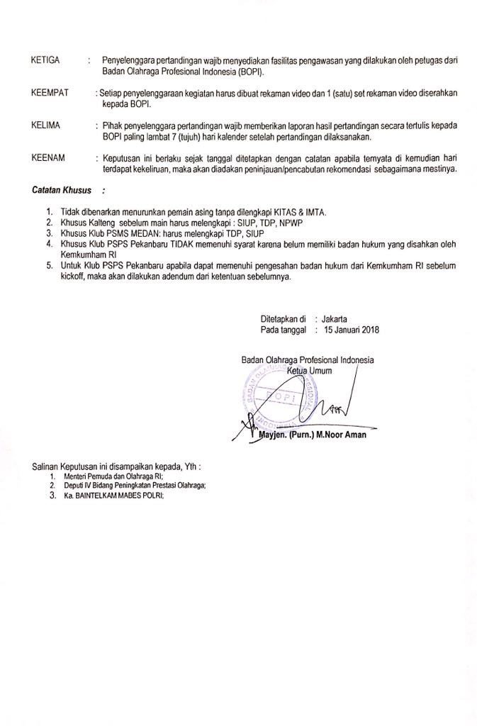 Dalam surat bernomor SR.SB.003/BOPI/KU/I/2018 yang ditandantangani Ketua Umum BOPI, Noor Aman, mereka menegaskan memberi rekomendasi pada PSSI untuk menyelengarakan Piala Piala Presiden 2018. Namun, hanya ada 19 dari 20 klub peserta yang direkomendasikan BOPI untuk tampil pada ajang ini.
