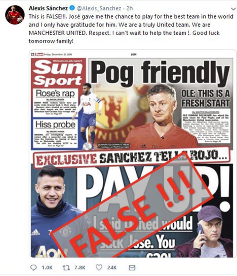 "Ini Bohong!!! Jose memberi saya kesempatan bermain untuk tim terbaik di dunia, dan saya hanya bisa berterima kasih kepadanya," tulis Alexis Sanchez di akun media sosial Twitter miliknya, dikutip dari Goal.