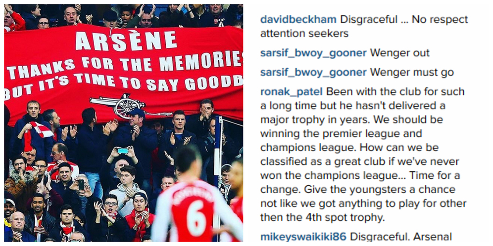 Meskipun tak pernah menjadi pemain Arsenal, Beckham menaruh simpati pada Wenger. Melalui akun Instagram, Beckham mengatakan para suporter tersebut hanya orang-orang mencari perhatian.