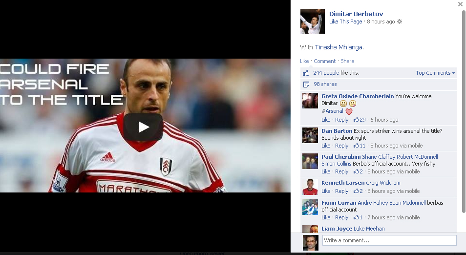 Melalui account Facebook resmi miliknya, Berbatov mengunggah foto yang diambil dari cuplikan video talkshow olahraga yang membahas soal kepindahannya menuju Arsenal.