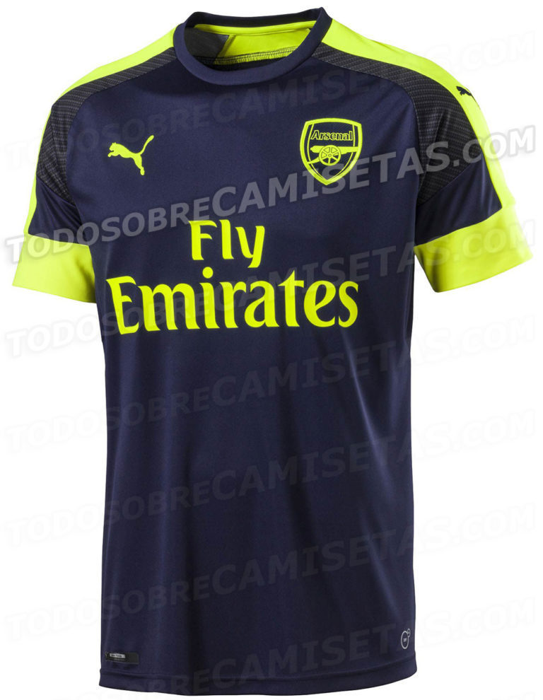 - Jersey Arsenal ketiga untuk musim 2016/17 meskipun belum dikenalkan secara resmi namun sudah beredar di internet. Berdasarkan foto yang diungkapkan Todo Sobre Camisetas, seragam The Gunners ketiga tersebut akan mengombinasikan antara warna biru dan kuning.