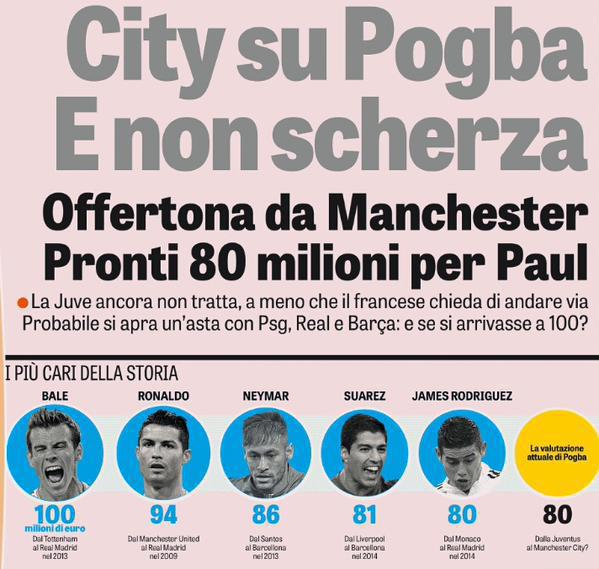 Manchester City kabarnya siap memberikan Pogba kontrak dengan nilai 9 juta euro per tahun di Etihad - atau jauh lebih tinggi dari apa yang ia terima di Turin saat ini. Ia bahkan berpotensi menjadi pemain termahal di dunia jika memang akan pindah ke klub lain di musim panas. [initial]