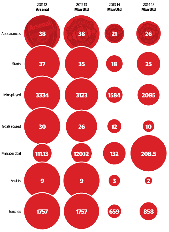 Padahal di awal kedatangannya di Old Trafford, Van Persie bisa mencetak 26 gol dari 38 penampilan. Tapi catatan tersebut tetap kalah jika dibandingkan dengan musim terakhirnya bersama Arsenal, di mana ia mampu mengumpulkan 30 gol dari 38 penampilan.