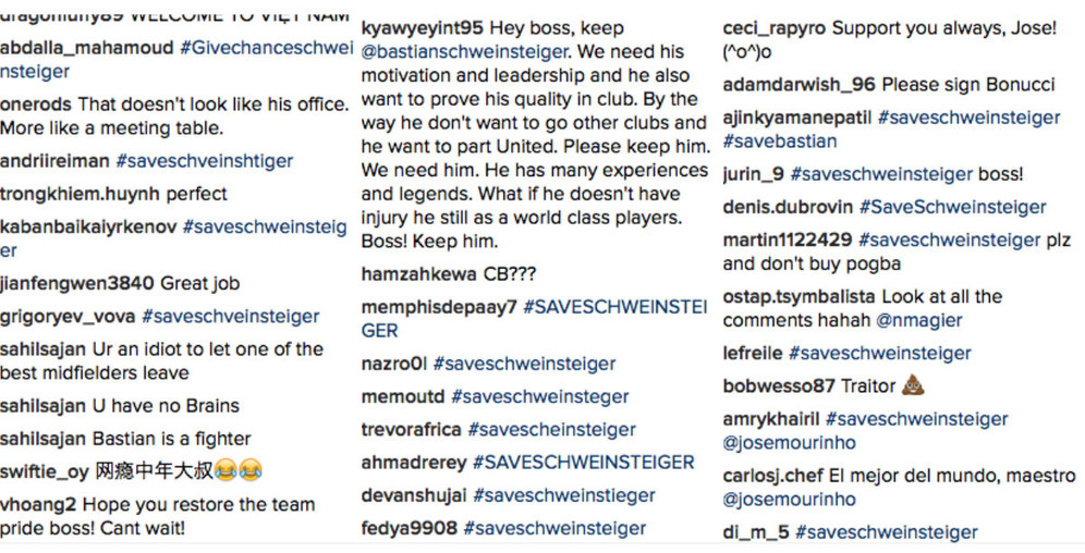 Tak heran ketika Mourinho mengunggah foto dirinya sedang bekerja di kantornya, di akun Instagram, banyak penggemar MU yang memberikan komentar sembari menambahkan tagar #SaveSchweinsteiger - sebagai bentuk dukungan pada pemain Der Panzer.
