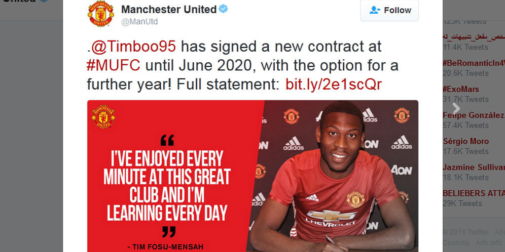 "Saya senang telah menandatangani kontrak baru di Manchester United. Saya menikmati setiap menit sejak bergabung dengan klub sebesar ini dan ingin melanjutkan perkembangan yang sudah membawa saya sejauh ini," kata Fosu-Mensah di laman resmi klub.