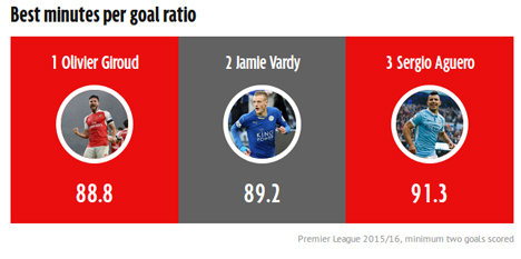 Sang pemain kini sudah mengumpulkan lima gol di Premier League, namun dalam hal rasio gol per menit, terbukti Giroud jadi yang paling unggul dengan angka 88,8. Catatan tersebut membuatnya lebih hebat dari Jamie Vardy (89,2) dan bahkan mesin gol Manchester City, Sergio Aguero (91,3)!