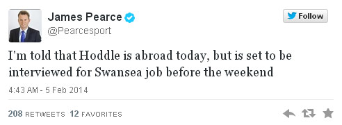 Laudrup sudah dipecat. Menurut media-media Inggris, kandidat terkuat manajer baru The Swans adalah Hoddle. Jurnalis James Pearce mengungkapkan bahwa Hoddle dijadwalkan melakoni interview dengan pihak Swansea dalam minggu ini.