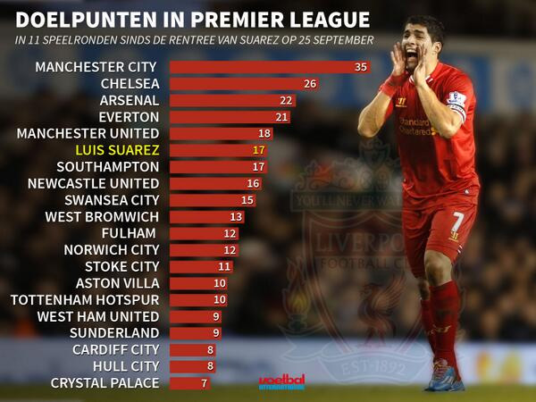 Suarez baru memperkuat Liverpool di pekan ke-6. Dari titik itu sampai pekan 16, striker Uruguay tersebut telah melesakkan total 17 gol dalam 11 penampilan dan memimpin daftar top scorer sementara dengan keunggulan empat gol atas Sergio Aguero.