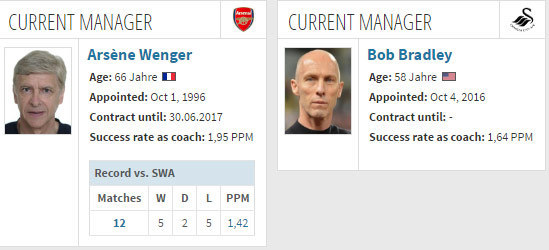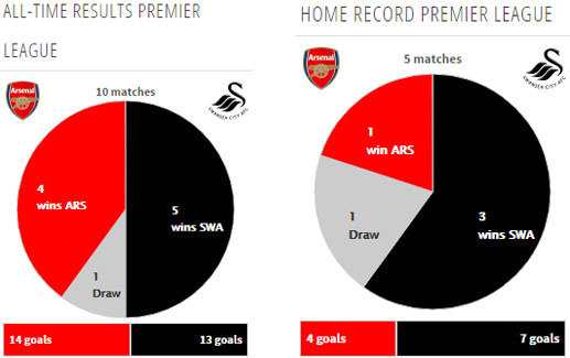 Lima kali menjamu Swansea di Premier League, Arsenal lebih sering kalah dan baru pernah sekali menang (M1 S1 K3). [initial]