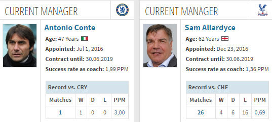 Bola.net - - Pemimpin klasemen Chelsea (69 poin) akan menjamu peringkat 16 Crystal Palace (28 poin) di pekan ke-30 Premier League 2016/17, Sabtu (01/4). Chelsea memenangi dua laga terakhirnya kontra Palace di Premier League, tapi kedua-duanya didapatkan di kandang lawan.