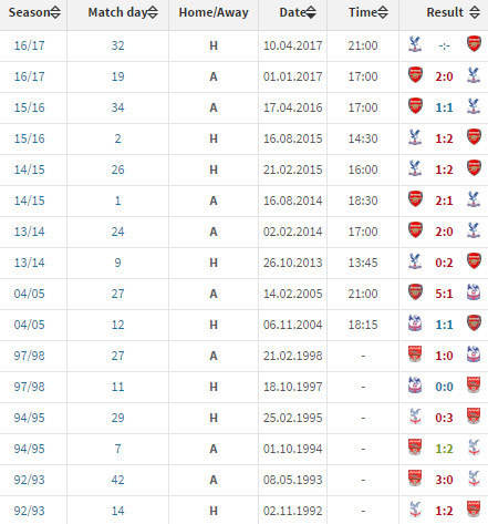 Pada pertemuan pertama di Premier League musim ini, Arsenal menekuk Palace 2-0 di Emirates Stadium. Arsenal menang lewat gol-gol Olivier Giroud dan Alex Iwobi.