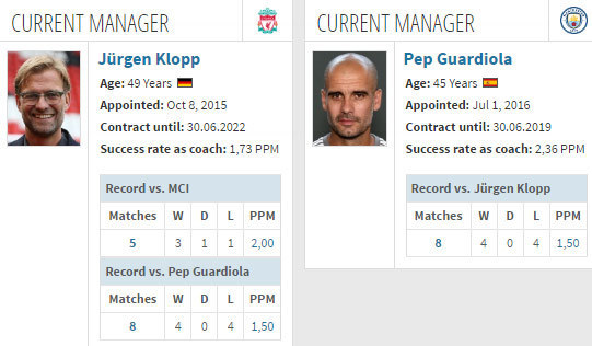 Jurgen Klopp dan Josep Guardiola sebelumnya sudah delapan kali bertemu ketika melatih Borussia Dortmund dan Bayern Munchen. Rekornya seimbang, sama-sama menang empat kali.